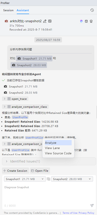 智慧调优内存分析整体使用流程和冷启动/卡顿丢帧较为相似,主要区别在于若使用Snapshot模板对堆快照问题进行分析时,支持在对话框中选择单个Snapshot分析,或选择两个Snapshot进行对比分析。开启分析任务后,AI会按类聚合,返回内存占用靠前的类信息,此时选中某个类点击Analyze