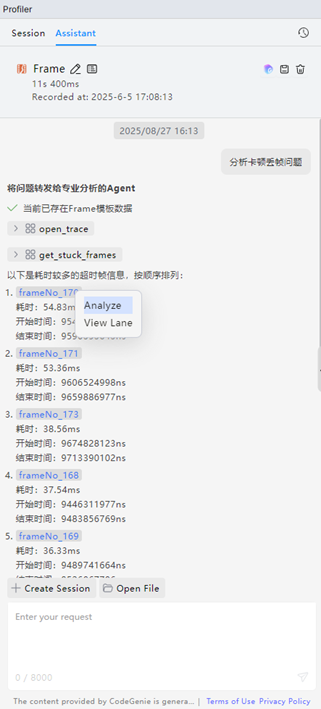 开启分析任务后,AI会分阶段进行性能问题定位与分析。以卡顿丢帧场景为例, AI首先会进行超时帧定位,定位完成后,选中超时帧,点击Analyze,深入挖掘当前帧具体问题场景,找到影响性能的可能原因。