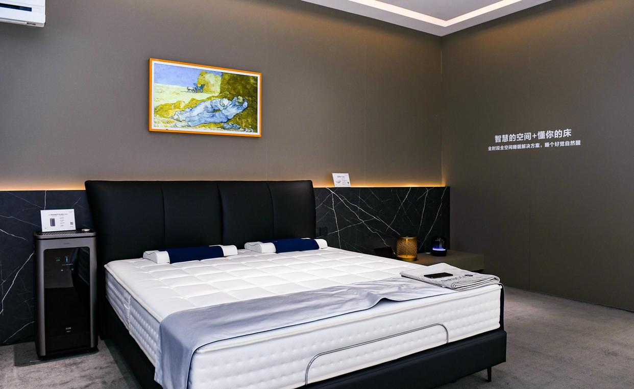 在卧室休憩场景中,智能床与IAM智能消毒空气净化器X5