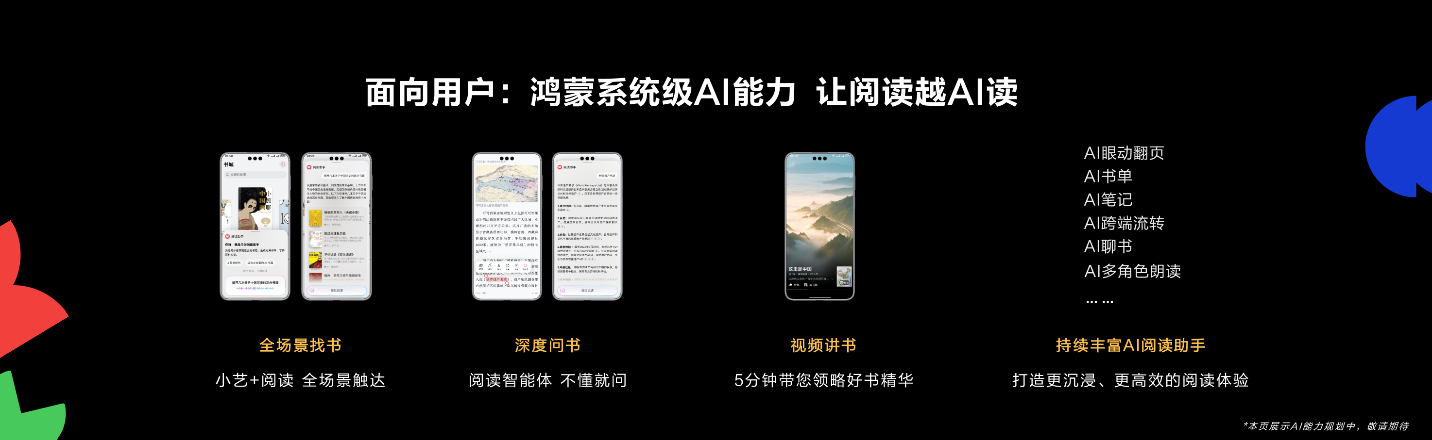 在阅读场景下,华为阅读在鸿蒙系统级AI能力的加持下,能够基于用户个性化需求提供全场景找书、深度问书、视频讲书、AI眼动翻页等功能,打破传统的阅读方式,带来更智慧、更高效的阅读新体验。