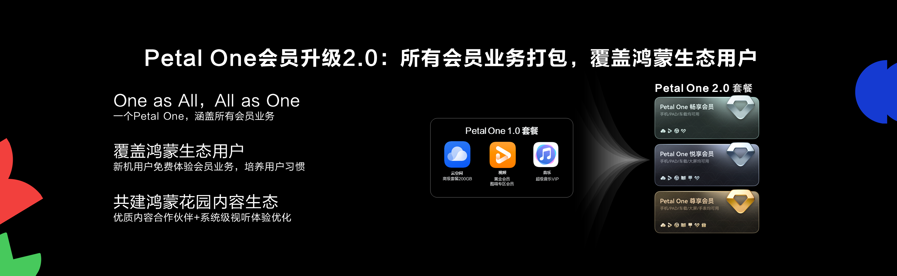 此外,华为Petal One会员全面升级,推出3个套餐,涵盖6个会员业务,通过整合更多会员权益来提升内容价值,把伙伴的精品内容惠及到亿级的鸿蒙全场景终端用户,通过会员的增长,带动内容的消费,持续为伙伴创造商业价值。