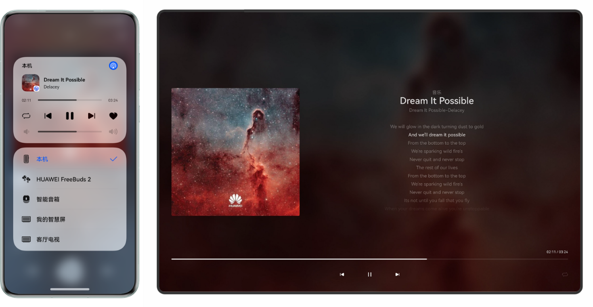 截至目前,鸿蒙生态已有多款头部音视频应用接入鸿蒙投播能力,覆盖长视频、音乐场景,让“大屏看视频、沉浸看歌词”触手可得。在音乐与音频领域,华为音乐通过系统级播控中心实现跨设备无缝投播,支持一键将音频内容投放至其他设备播放,更具音乐沉浸感。在长视频领域,如咪咕视频、腾讯视频、bilibili等,集成全局投播组件,用户可在应用内或播控中心直接调用投屏服务,提升大屏观影体验。
