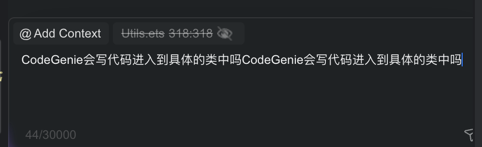 首先,有一个问题让我困惑的是,比如我复制了问完其他AI IDE的一句话,粘贴到CodeGenie中时就是显示两遍,比如我复制“CodeGenie会写代码进入到具体的类中吗”,在CodeGenie中粘贴如下图: