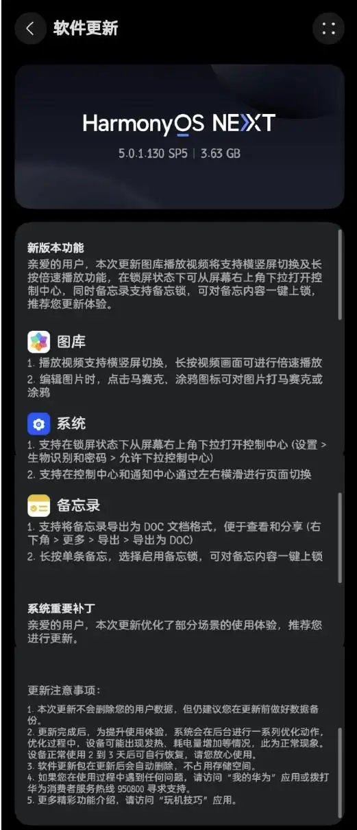 本次更新图库播放视频将支持横竖屏切换及长按倍速播放功能,在锁屏状态下可从屏幕右上角下拉打开控制中心,同时备忘录支持备忘锁,可对备忘内容一键上锁,系统包大小约3.63GB。