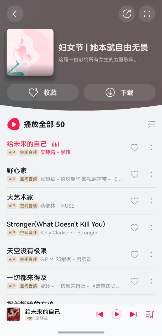华为音乐推出「她本就 自由无畏」主题歌单。汇聚G.E.M. 邓紫棋《天空没有极限》、梁静茹《给未来的自己》、莫文蔚《独一/无二》等跨越多种风格的女性赞歌,每首歌都有超高清音频,带你倾听细腻饱满的声线!还能切换空间音频,沉浸式感受歌曲里的洒脱与自信,在旋律中找到共鸣与力量。