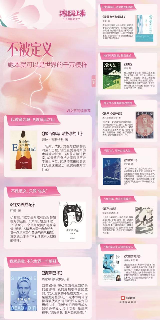 华为阅读妇女节专题书单暖心上线,汇集《你当像鸟飞往你的山》《俗女养成记》《清算已毕》等佳作,用文字记录女性的多样人生与成长力量。依托AI动态图书、AI眼动翻页、精品音色听书等功能,带来更沉浸的阅读体验。正如书单主题而言——「不被定义,她本就可以是世界的万千模样」,愿每一位女性都能在书中找到属于自己的答案。