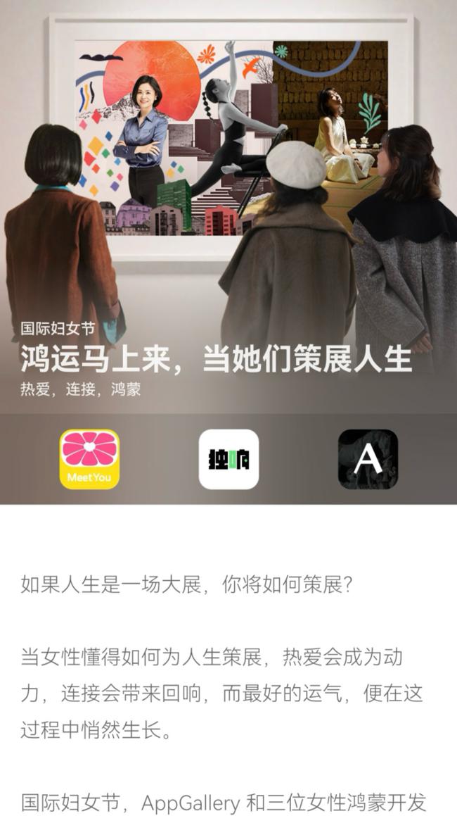 从探索应用到装扮设备,从视听享受到阅读滋养,鸿蒙应用在这个妇女节,以「鸿运马上来」为主题串联起科技与人文的温度。即日起,打开上述鸿蒙应用,即可发现专属内容与限时福利。鸿蒙生态里的每一次探索都是让每个她看见自己的万千可能,因为无需刻意雕琢,她的闪光本就动人。