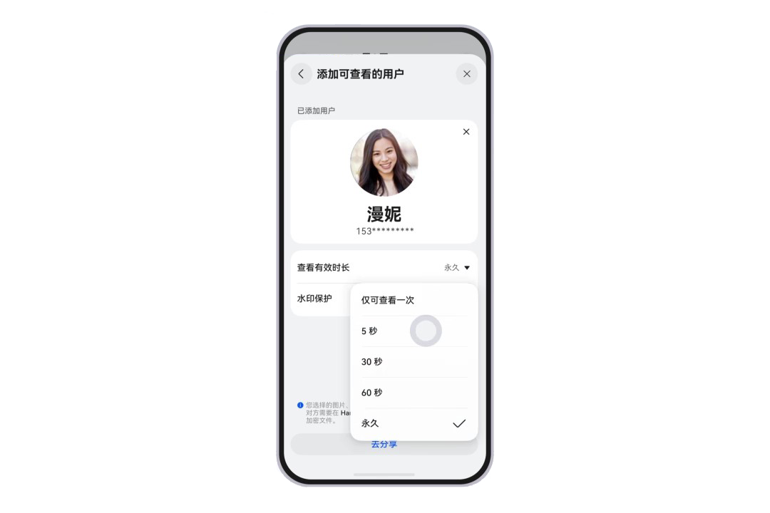 备受用户好评的“加密分享”功能再升级,新增限时查看和添加水印功能。在加密分享文件、图片、视频时,用户可设置“查看有效时长”,比如查看有效时长设置为 5 秒,收到文件的用户打开文件只有 5 秒查看时间,5秒后文件将被销毁,无法继续查看,也无法转发给别人。分享加密文件时打开“水印保护”开关还可以自动对文件设置水印,可有效防止加密文件被滥用,降低泄密风险。