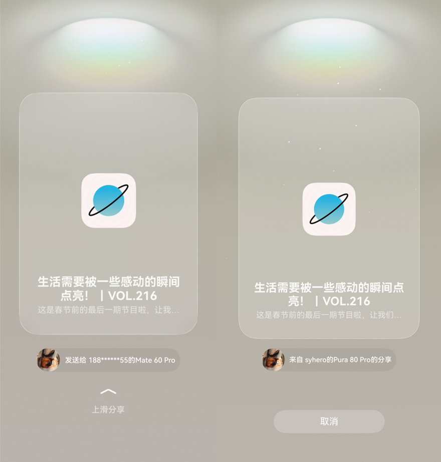 挖到心仪的播客,想第一时间分享给家人朋友?不用复制链接、不用扫码、不用等加载,两台鸿蒙手机轻轻一碰,心仪播客节目即刻“直达”对方设备;或者隔空一抓一放,内容瞬间传送,像变魔术一样自然。这个春节,让好声音在亲友间“碰”出共鸣。