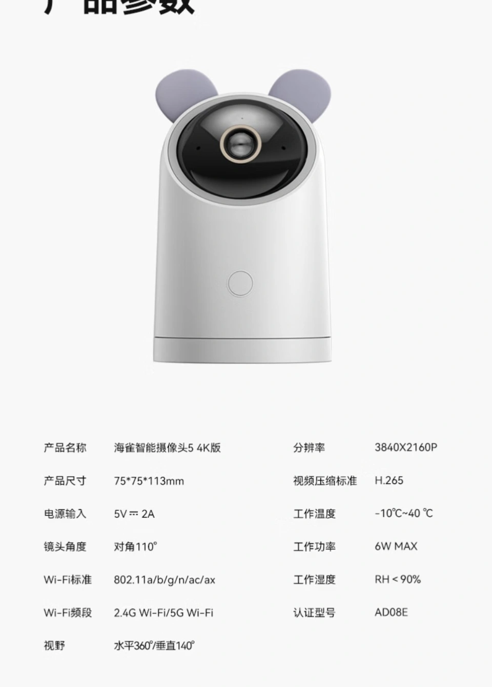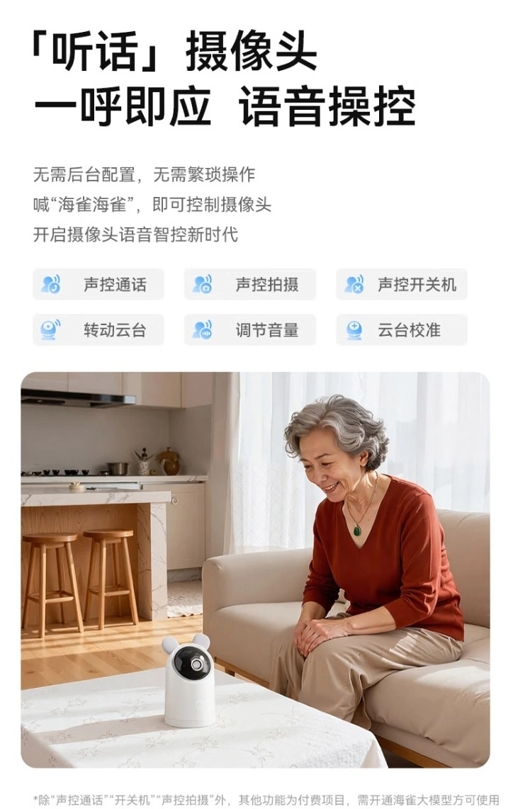 该摄像头支持水平旋转 360 度 / 垂直旋转 140 度,搭载 800 万像素传感器 F1.6 光圈镜头,匹配 4 颗 850nm 红外灯,可实现 10 米红外夜视。其内置海雀大模型(官方称属于增值功能,需搭配套餐购买或付费开通),能够理解复杂模糊的语音指令,用户可直接通过唤醒词控制摄像头操作。