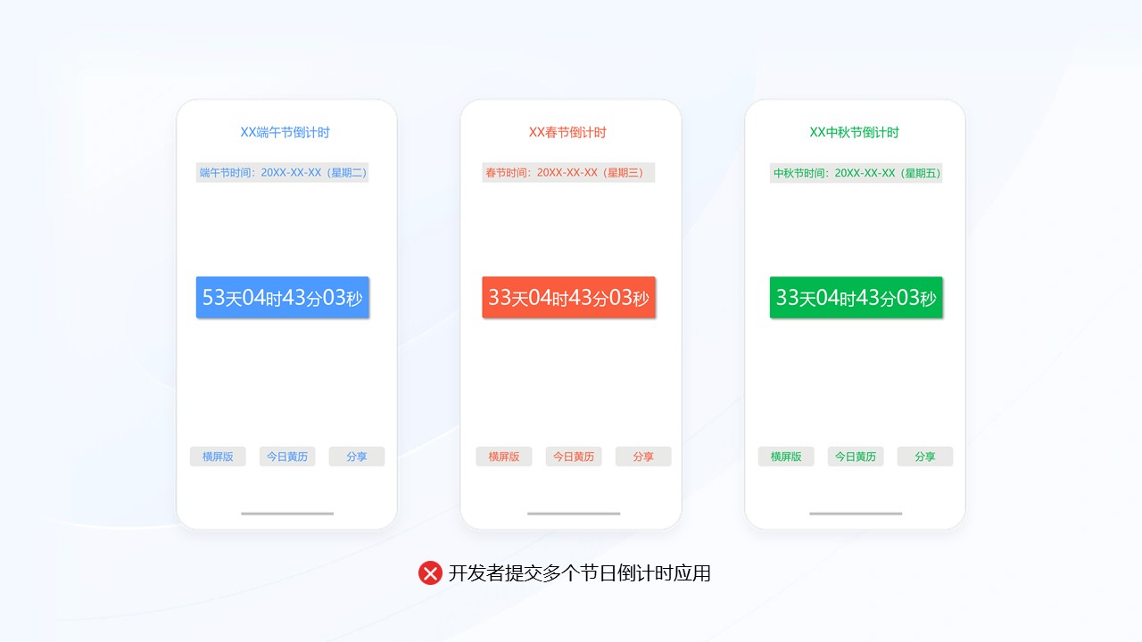 场景1:不收录同一开发者提交多个节日倒计时应用,如端午倒计时、春节倒计时、中秋节倒计时。