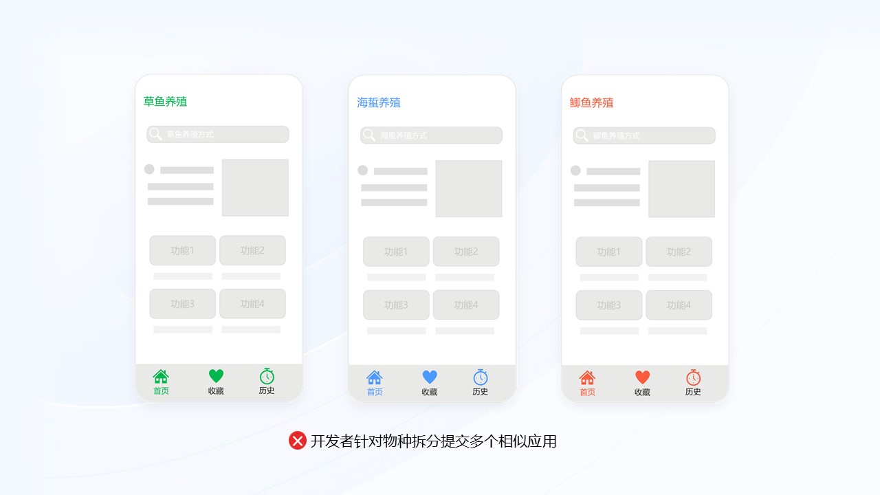场景2:不收录同一开发者对不同物种拆分提交多个相似应用,如草鱼养殖、海蜇养殖、鲫鱼养殖。