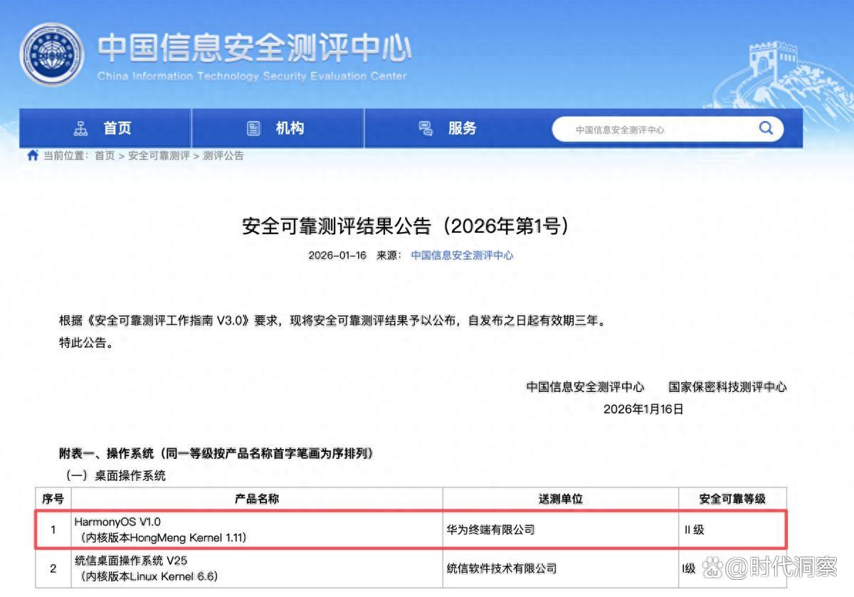 Linux中年人 2026-01-26 13:30:12 发布近日,中国信息安全测评中心发布《安全可靠测评结果公告(2026年第1号)》HarmonyOS V1.0 通过最高安全可靠等级Ⅱ级评测认证,成为目前首个达到该等级的国产桌面OS,在信息安全领域树立了新的标杆。