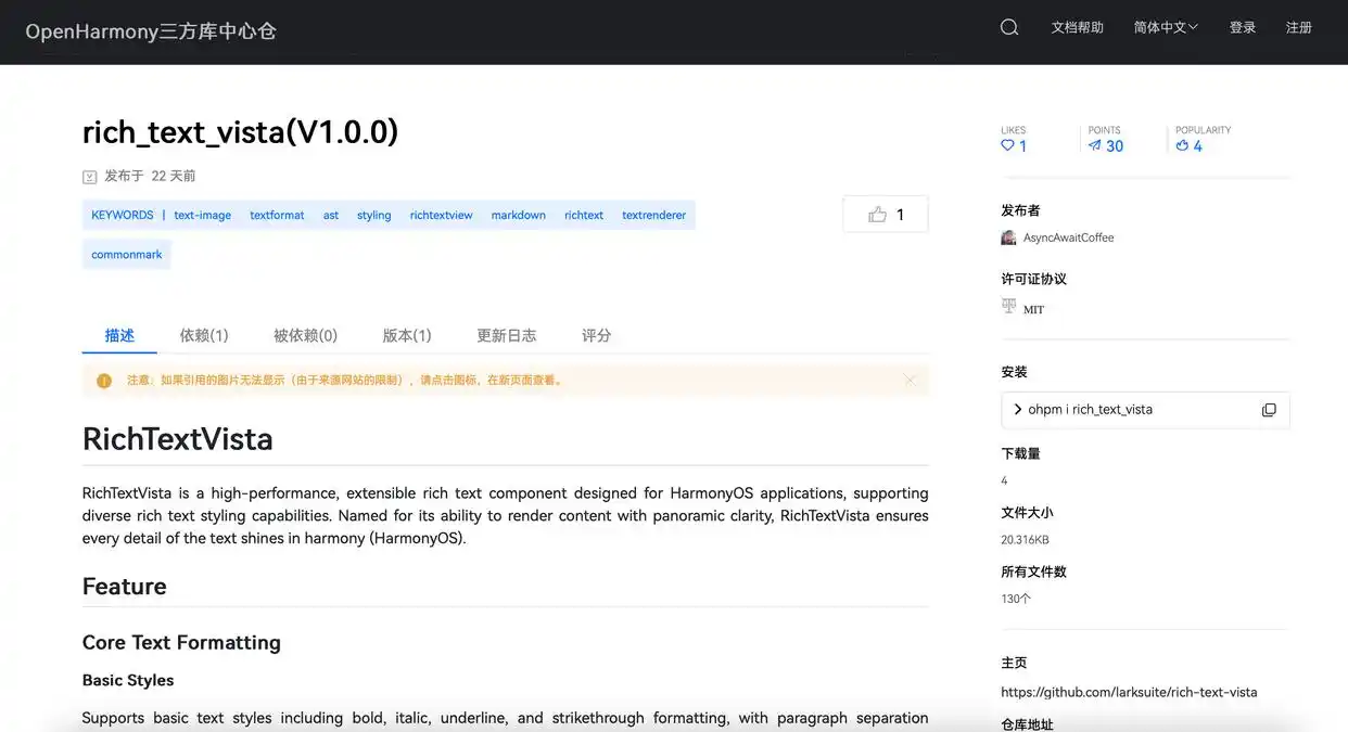 目前,RTV组件已正式上架OpenHarmony三方库中心仓和鸿蒙开发者官网。开发者可搜索“rich_text_vista”获取源码及相关文档,快速集成,提升应用表现力。