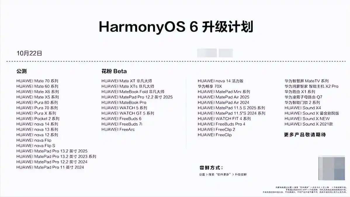 华为表示首批 90+ 机型从 10 月 22 日起陆续开放公测入口,11 月中下旬会把 Pura 70、Mate 70 等近期旗舰放入公测,2026 年初再扩大到 Mate 60 等老机型。
