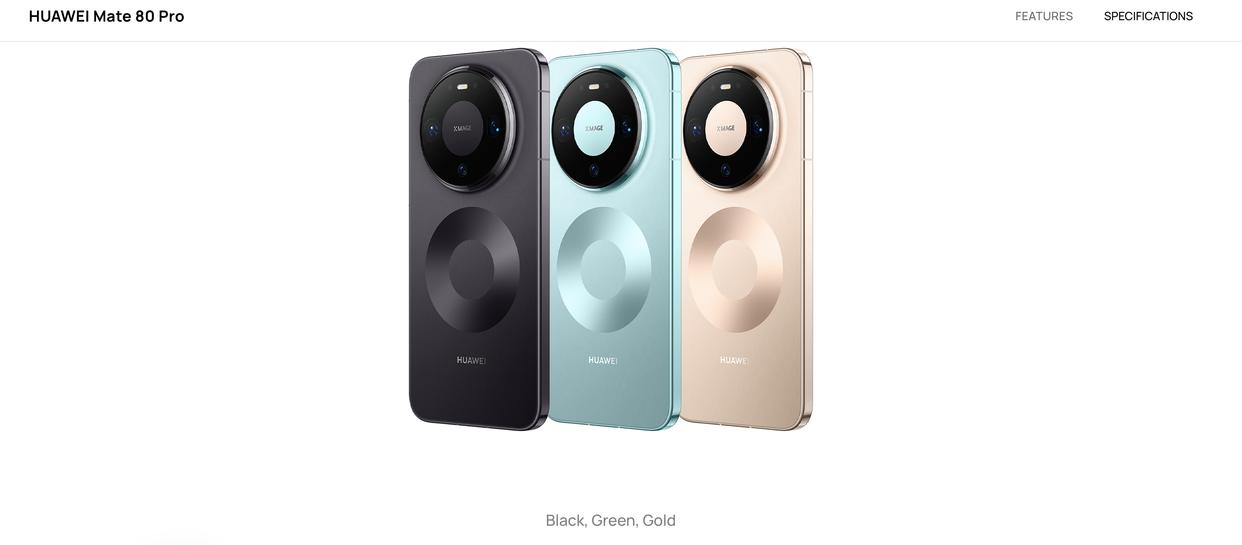 从华为全球官网可以看到,华为Mate 80 Pro海外版有晨曦金、云杉绿、曜石黑三种不同配色可以选择。