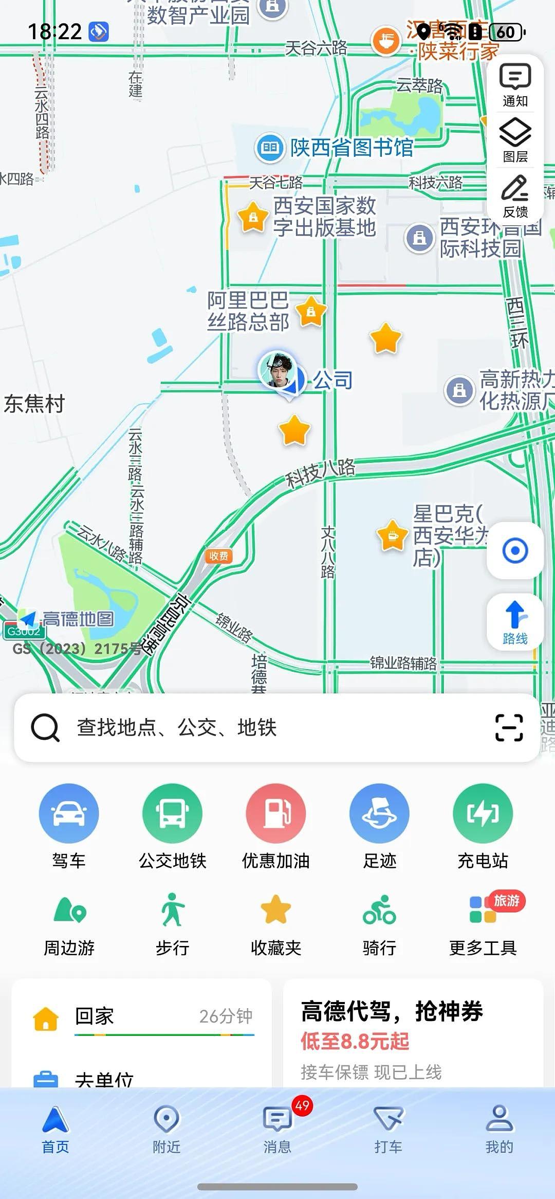 导航时在高德地图首页点击左下角车辆按钮可体验多种特权。