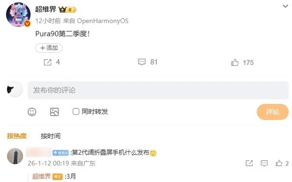 同一爆料源“超维界”在与网友互动时还透露,华为第二代阔折叠手机Pura X2有望在今年3月率先发布,这将为华为春季新品阵容拉开序幕。