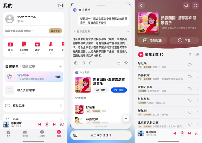 在“我的-自建歌单”里点进音乐助手,直接说:“帮我建一个适合全家老小春节聚会的背景音乐,要喜庆但不吵闹。” 话音刚落,一份量身定制的歌单就生成好了,一键保存,万事俱备。