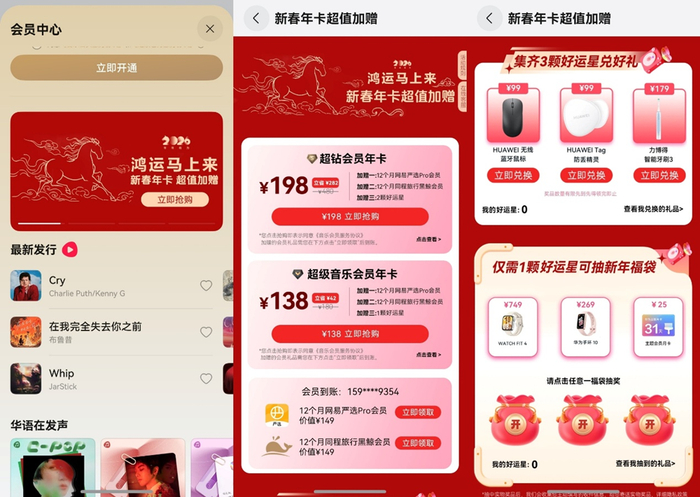 听感体验这么好,福利自然也不能少。大家记得去华为音乐“我的-会员中心”,找到“鸿运马上来-新春年卡 超值加赠”的活动卡片。现在的活动超级划算:198元开通超钻会员年卡,不仅能全年畅享超高清和空间音频等音质权益,还加赠12个月的网易严选Pro会员和同程旅行黑鲸会员,并能领取2颗“好运星”参与兑换或抽奖。