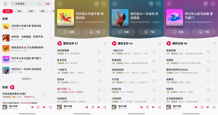打开华为音乐搜索“马年贺岁”,直接承包了我的春节氛围感歌单。既有此刻春运最应景的《归乡路》,也有春节团圆常备的《常欢聚》《抢红包》,连拜年专用的《拜大年》、初五的《迎财神》都安排得明明白白。