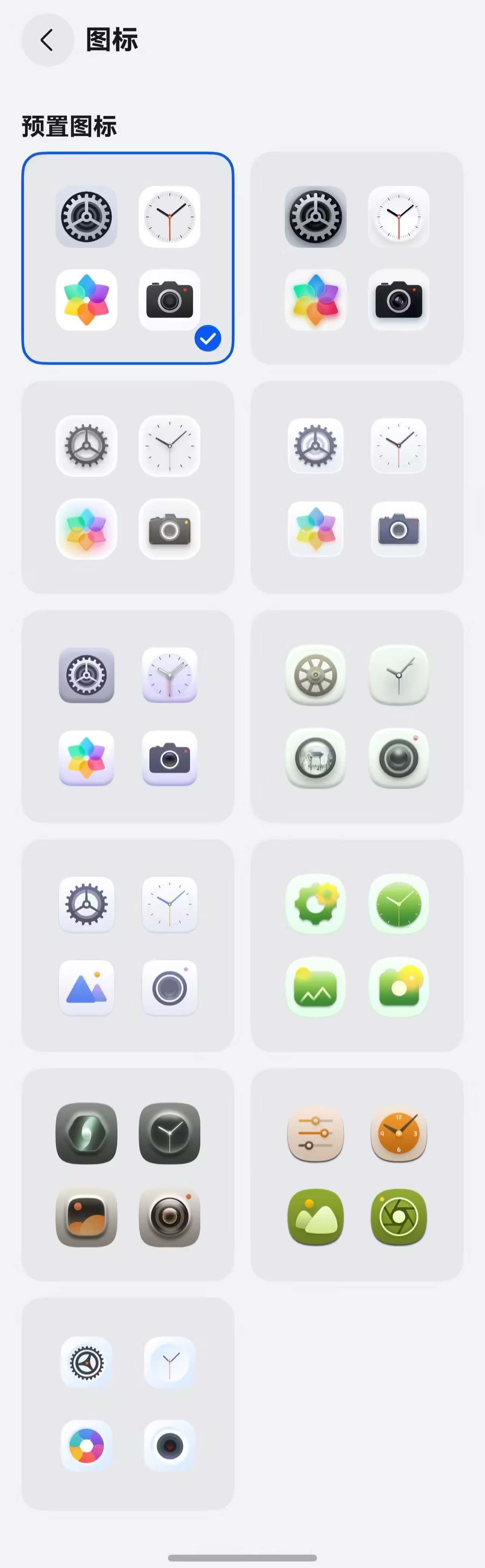 据用户反馈,升级至鸿蒙 HarmonyOS 6.0.0.108 SP2 Developer 版本的华为手机新增了 9 套预置桌面图标,且风格各有不同,包括拟物、扁平等类型(下图中前面 2 套为此前一直存在的两款图标,后面的 9 套为新增图标)。