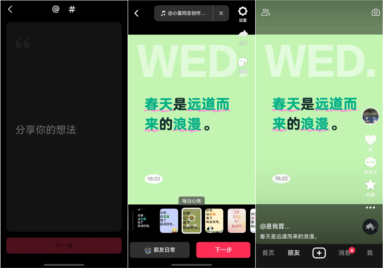 短视频创作:支持文字拍摄模式,随心记录心情想法,还可@好友、添加#话题标签,纯文字内容也能拍出高级感、营造氛围感。