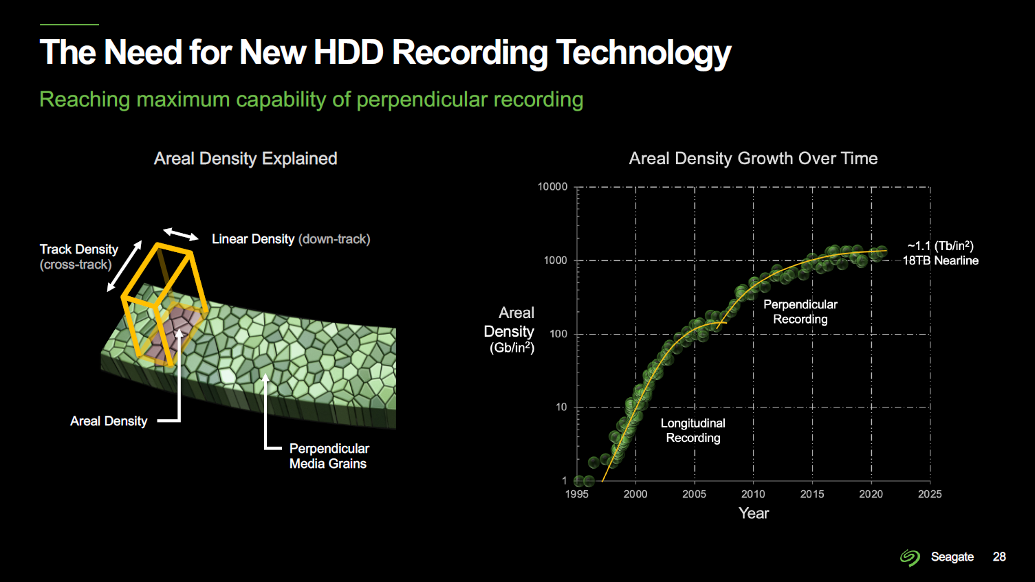 磁记录技术是硬盘进化的最有力见证。磁记录技术历经了以磁感应磁头、磁阻磁头、巨磁阻磁头等为代表的水平磁记录(LMR)技术,之后进化到当前业界主流的垂直磁记录(PMR)技术,以及由希捷研发的行业公认的新一代磁记录技术——热辅助磁记录(HAMR)。硬盘的面密度随之也一路飙升,水平磁记录技术面密度极限约为110Gb/平方英寸,采用垂直磁记录的希捷银河(Exos)18TB面密度高达1.1Tb/平方英寸,而希捷的热辅助磁记录(HAMR)技术能够为磁盘带来20%的年度复合容量增长,可实现1.2至4Tb/平方英寸的面密度,单碟容量未来将有望达到7TB。
