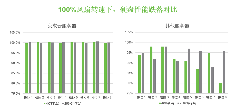 希捷C3实验室对产品的硬盘性能进行了实际测试验证。实验结果显示,采用这一设计方案,即便风扇在100%转速下,部署于服务器中的希捷银河(Exos)X18企业级硬盘的性能依然毫发无伤,仍然可以达到100%峰值(如图),系统性能释放能力堪称卓越。相比之下,传统服务器架构,4K随机写性能则会跌落到80%。