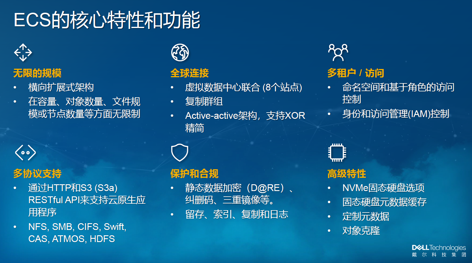 保护和合规,数据保护上静态数据加密和动态数据加密,纠删码,三重镜像,跨区域复制等;在合规上戴尔有很多措施,保证用户的数据不会被未授权访问,高级留存管理、索引、日志: ECS支持基于策略和基于事件的记录留存和平台强化 WORM功能,支持内部+外部密钥管理器:等