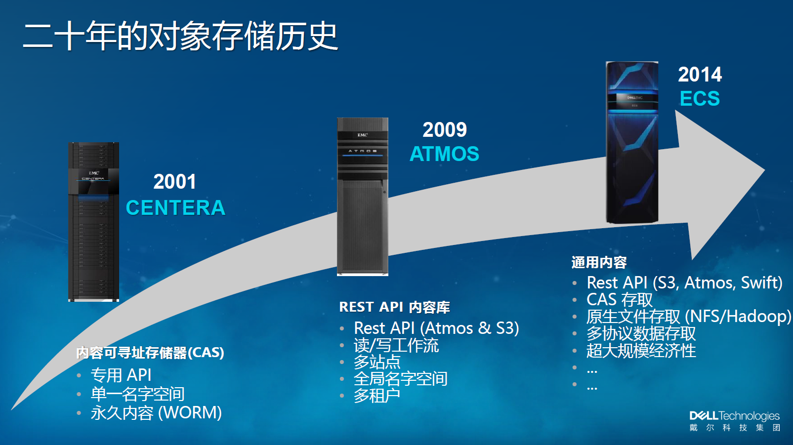 作为对象存储的资深玩家,戴尔易安信第一代对象存储是2001年推出的Centera,主要针对数据归档和法规遵从场景进行设计。第二代对象存储Atmos以平台的定位进入到数据中心,同时由于跨地域数据复制,跨地域数据访问特性的引入。第三代对象存储ECS,这是全球第一款直接支持Hadoop大数据分析平台的对象存储产品,,支持海量数据的存储、保护、访问和分析。
