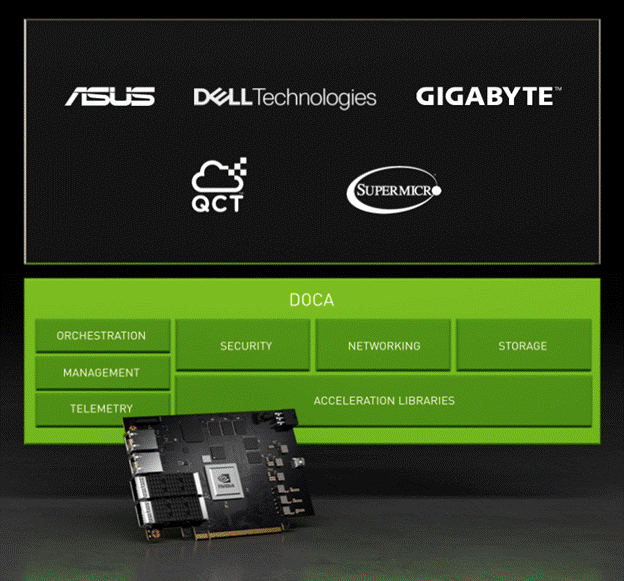 图片说明:华硕、戴尔科技、技嘉、云达科技和超微已宣布将提供采用NVIDIA BlueField-2 DPU加速的服务器。