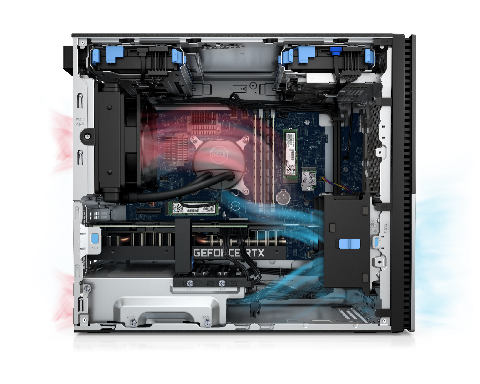 我们的工程师精心改造了这款设备的散热架构,力图通过改善气流实现性能最大化并降低噪声。机箱前挡板的设计旨在吸入冷空气,使之流向后方,最终从机箱背面排出。值得一提的是,新款XPS台式电脑在运行状态下的冷却效率提升多达21%(搭载125瓦冷却解决方案);搭载水冷系统时,运行状态下的冷却效率则可进一步提升18%(相比新型125瓦散热解决方案) 。而且,新型高转速风扇(最高转速达5000转/分钟)在较低速度下运行效率更高,能让机器更加安静。总体而言,新款XPS台式电脑运行时的噪声水平较前代机型降低50%以上 ,让你能够专心一意地发挥出最佳状态,高效完成工作。