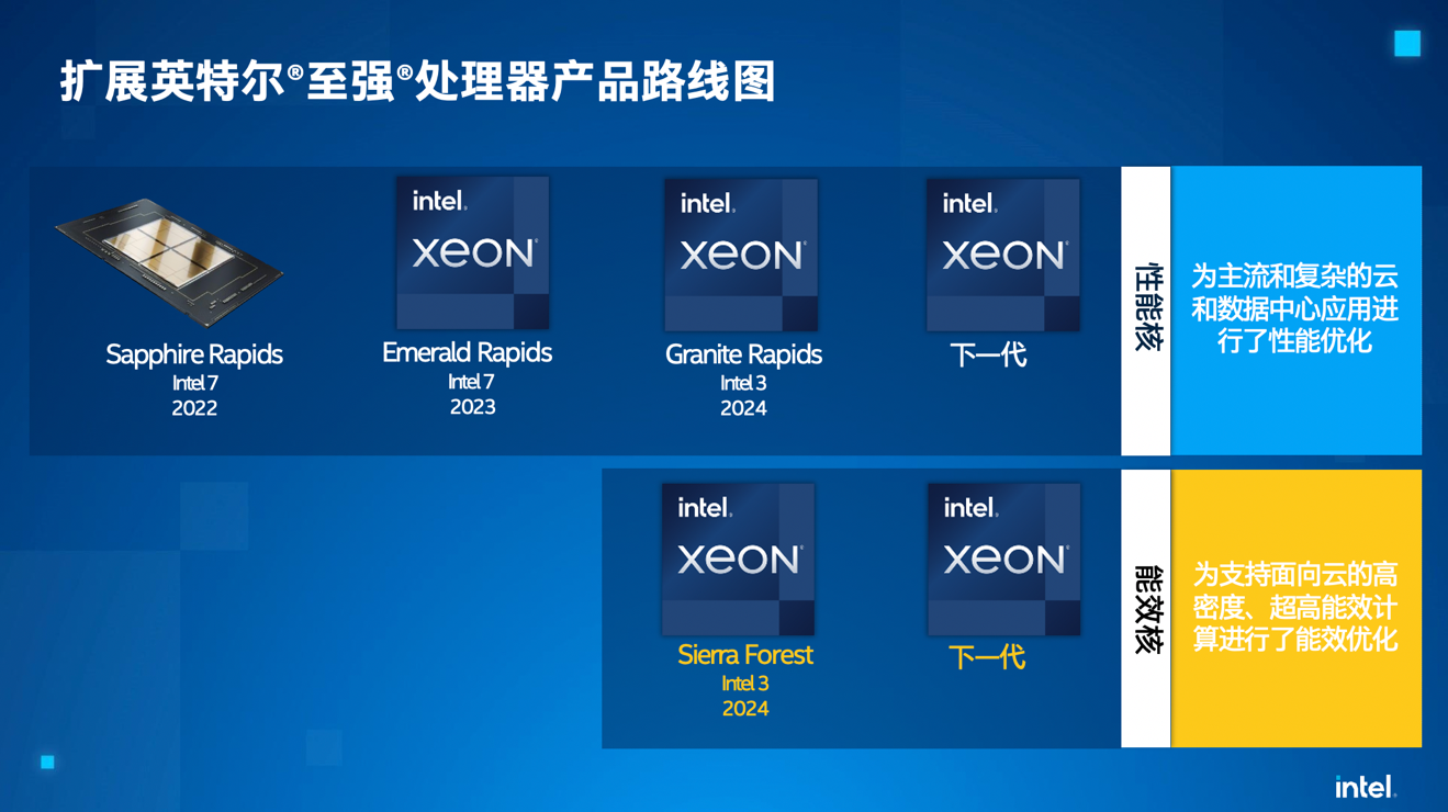 - 2024年,英特尔将推出革命性的全新能效核至强处理器Sierra Forest,这是一款基于Intel 3制程工艺,具备高密度和超高能效性能的领先产品。