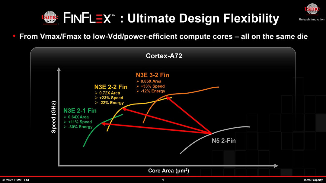 台积电(TSMC)在其2022年技术论坛上,介绍了N3制程节点使用的FINFLEX技术,扩展了工艺的性能、功率和密度范围,允许芯片设计人员使用相同的设计工具集为同一芯片上的每个关键功能块选择最佳选项。