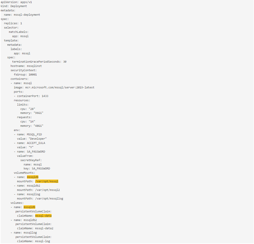 下面的例子显示了SQL Server pod的部署定义,其中一个挂载点和Persistent Volume Claims被突出显示。通过检查pod部署,我们可以看到呈现给SQL Server的文件夹/挂载点/var/opt/mssql与K8s卷mssqldb和底层的Persistent Volume Claims mssql-data绑定。