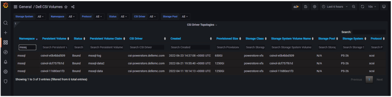 继续看这个例子,您可以看到其它的Persistent Volume Claims、mssql-data2和mssql-log是如何被SQL Server数据库文件使用的。下图显示了Grafana的一个仪表盘,它可以很容易地将SQL Server pod使用的mssql-data、mssql-data2和mssql-log的Persistent Volume Claims与Persistent Volume名称联系起来。