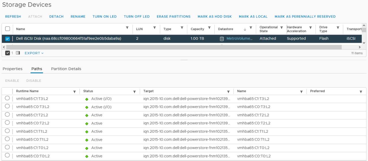 借助本机多路径(NMP)的"轮询调度"(RR)默认路径选择策略(PSP),ESXi主机使用所提供的ALUA路径信息来确定连接到卷的最佳工作路径。当有多个主动/优化路径可用时,ESXi PSP通过轮询调度(round robin)测算卷的延迟,以选择最佳工作路径。当前的工作路径在vCenter中显示为"主动(I/O)"状态,而其他路径只显示为"主动"状态。下图显示了城域卷配置完成后,统一主机配置中的ESXi主机的路径状态。