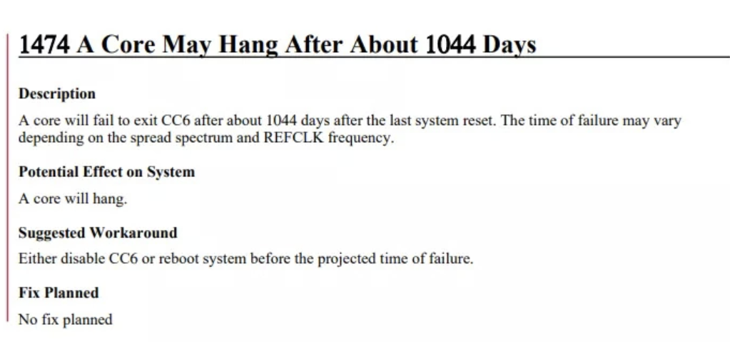 使用这款 EPYC 芯片的服务器,需要每隔2.93年时间重新启动一次,AMD官方表示不会修复上述BUG。