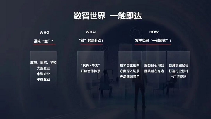 “找到了合作伙伴,也就是找到了华为。”吴辉说:“伙伴和华为更可以去主动去找客户。”而且更进一步,不管是大型企业,还是中小企业、小微企业,只要“一触”到“伙伴+华为”,就可得到自主创新的技术、深入场景的方案、适销易用的产品,配合在您身边的、贴心周到的服务团队,以及华为丰富的自身+行业标杆转型经验的复制,“即达”数智世界。
