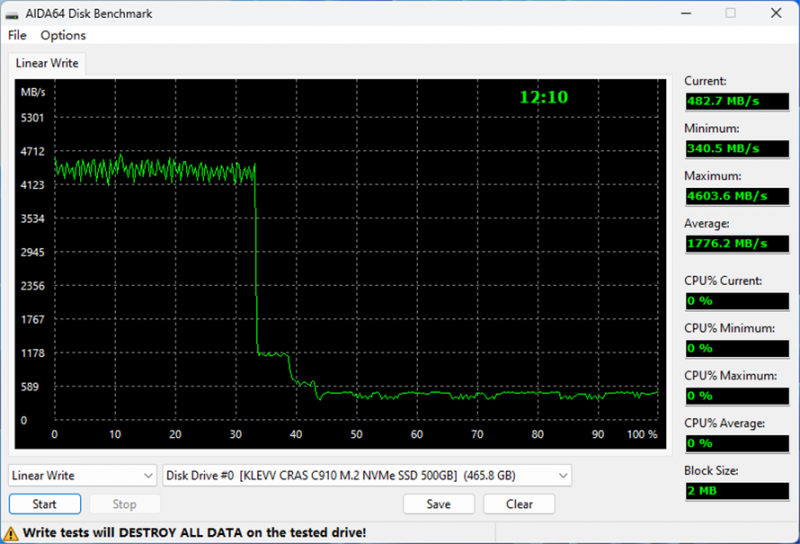 使用AIDA64 Disk Benchmark进行Linear Write测试,可以看到在写入33%左右时,硬盘速度从约4400MB/s掉速到约1178MB/s;写入40%左右时,速度便开始掉到480MB/s左右。硬盘的平均写入速度则是达到了1776.2MB/s。