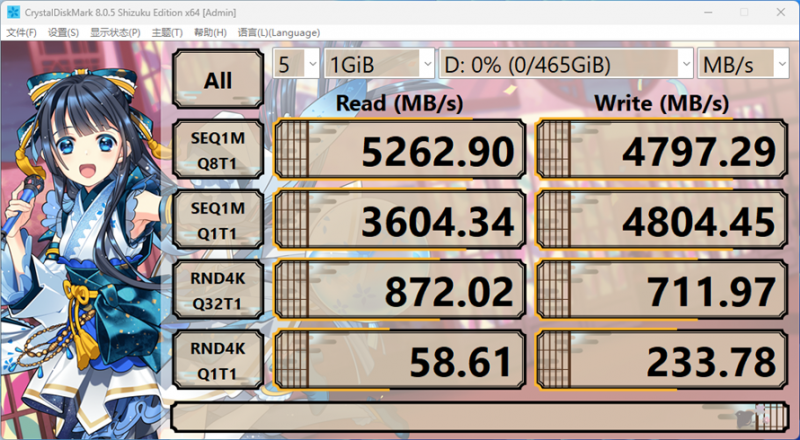 介绍了那么多,不如跑个分来得更为实际。CrystalDiskMark实测KLEVV科赋C910顺序读取速度达到了5262.9MB/s,顺序写入速度为4797.29MB/s,性能超出官方宣传数值,有超预期的表现。