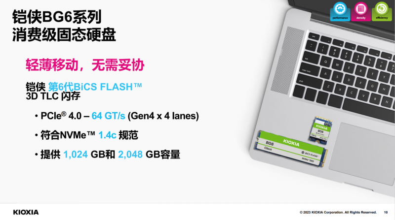 铠侠已经准备好了铠侠BG6系列消费级产品,在M.2 2230规格下最高提供2TB存储空间,支持PCIe? 4.0 x4,即可以提供64GT/s传输速率。同时还支持NVMe? 1.4c规范。这意味着不仅轻薄笔记本,平板电脑、游戏掌机也都能获得大容量扩展支持。