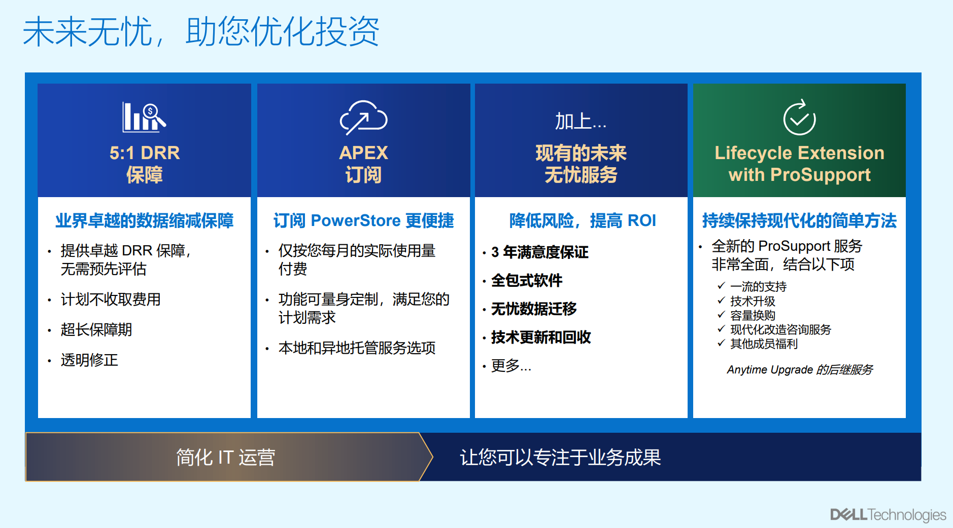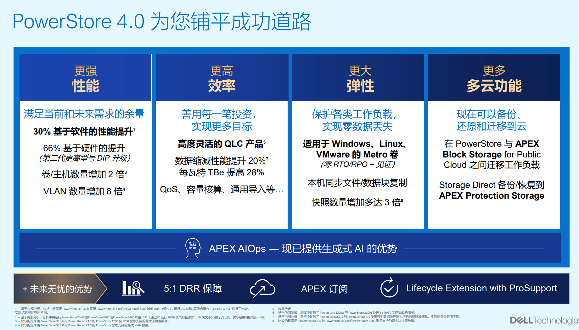 此外,全新PowerStore的AIOps功能通过三种模式提供了全面的监控和调优能力,确保系统在任何情况下都能保持最佳性能。同时,作为“未来无忧”计划的一部分,全新Power Store的数据缩减比提升至5:1,大大提高了存储效率。而灵活的订阅模式和扩容计划则进一步降低了客户的存储成本。这些综合措施共同确保了PowerStore Prime能够为客户提供卓越的性能和无忧的存储体验。