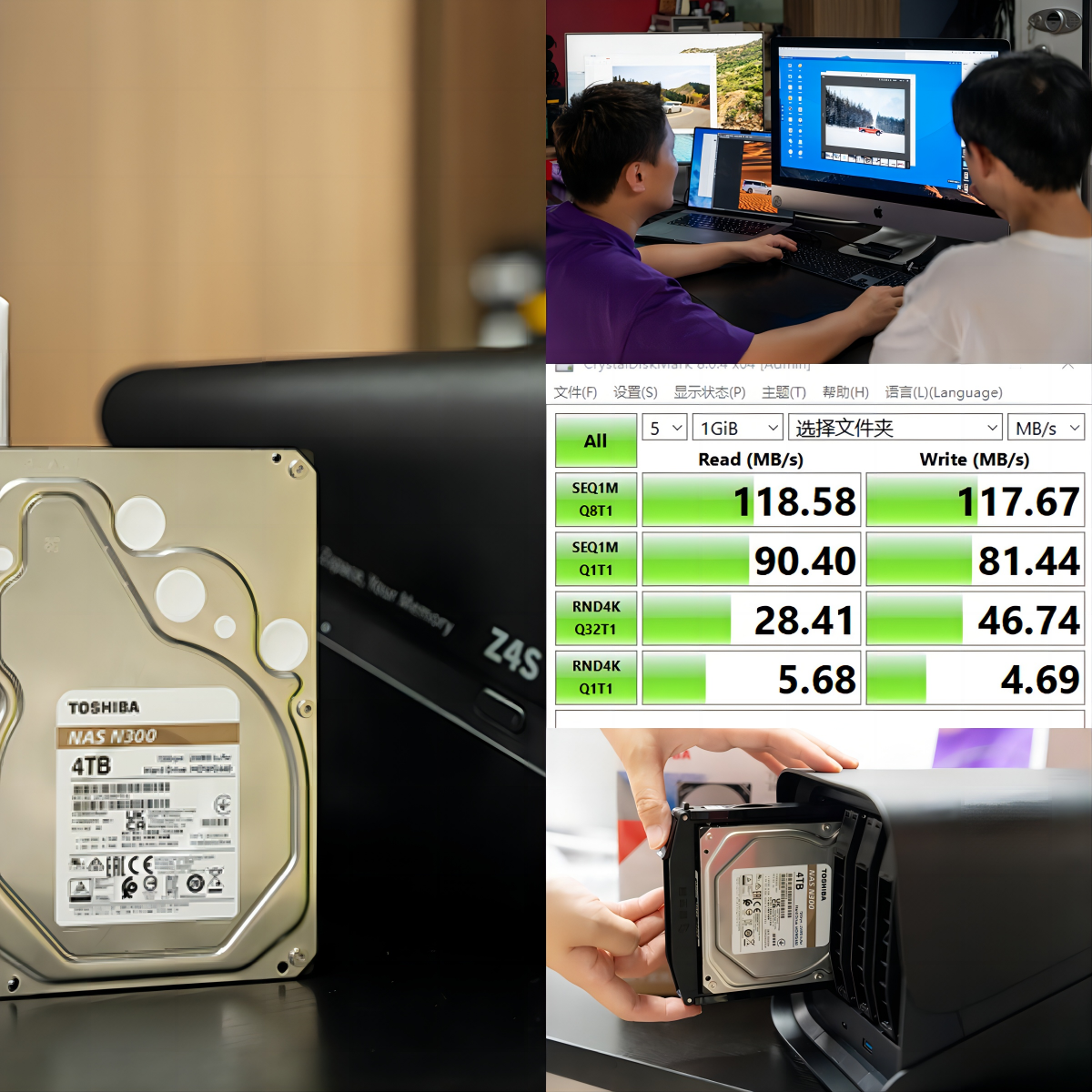 极空间Z4S是四盘位NAS,支持2.5和3.5英寸硬盘,最大支持单盘22TB/7200转,不仅能满足VEGSTUDIO菜市场工作坊当下的存储需求,还有着“战未来”的余地。与它搭配的4块4TB东芝N300系列NAS专用硬盘,首先在数据保护方面,有斜坡加载技术,能减少对记录磁头和介质的磨损,提升硬盘的可靠性,并有着7 x 24小时365天全天候的运行能力,搭载有旋转振动补充技术,能有效提高抗冲击和防振动;其次,在数据传输方面,可实现硬盘标称的274MB/s传输速度,提供对基本内容的快速访问。