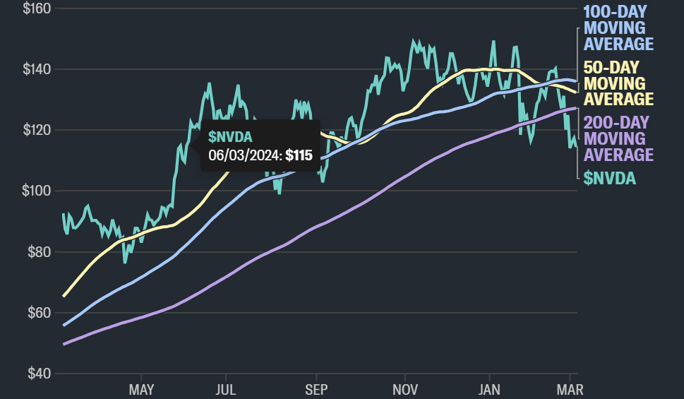 自2月26日公布第四季度财报以来,英伟达(Nvidia, NVDA)的股价已下跌9.8%,引发了一场抛售潮。由于对动量股票情绪的恶化,Nvidia股价已跌破关键的50天、100天和200天