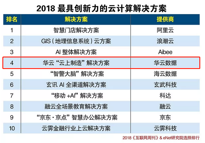 2018年,全国两会再提加快推进“百万企业上云”建议。壮大我国的云计算产业、深入实施“中国制造2025”,加快大数据、云计算、物联网的应用,已成为全民共识。华云数据“云上制造”解决方案入围2018最具创新力的云计算解决方案榜单,位列第四。华云数据凭借在私有云领域的丰富经验和在制造业上云领域成功的案例,赢得了评委的一致认可。