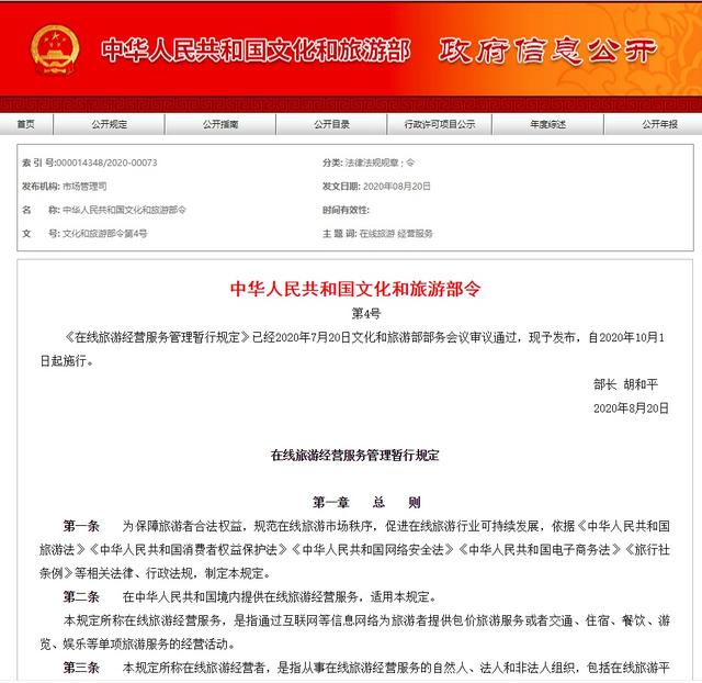 根据中国新闻网报道:8月31日,文化和旅游部公布《在线旅游经营服务管理暂行规定》,将于2020年10月1日起正式施行。