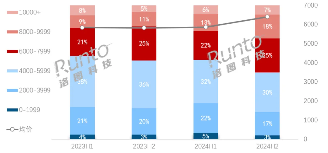 受国补政策实施的推动,2024年下半年笔记本市场降幅趋缓,部分区域甚至出现价格回升。在此背景下,线上市场爆款集中于高价位段,尤其是8000-9999元区间的销量占比提