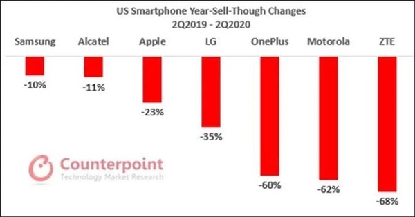 从统计机构Counterpoint给出的数据来看,今年二季度,北美区手机销量同比下滑25%之多,几大头部品牌无一幸免。其中三星